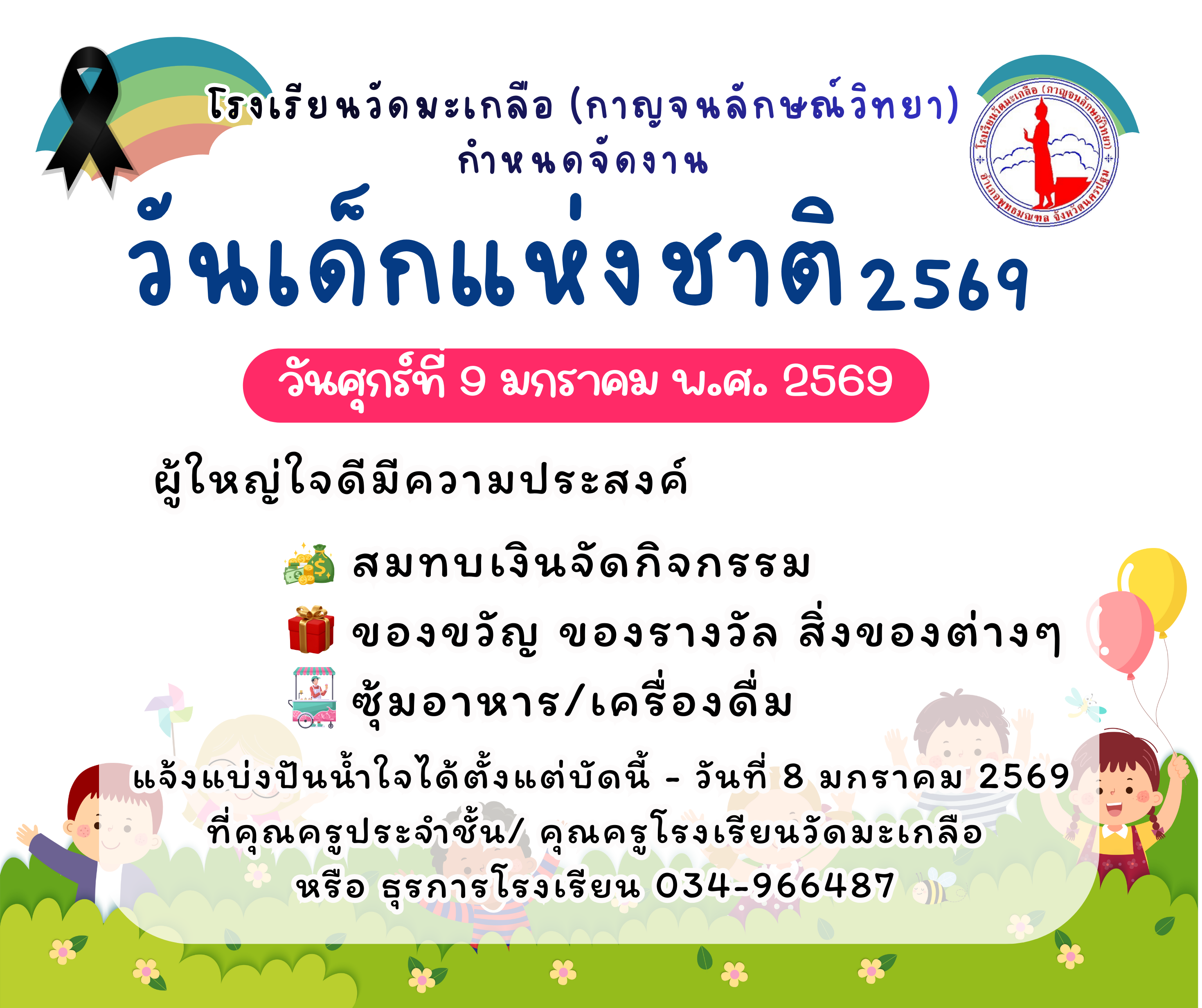 ฝากครูประจำชั้นประชาสัมพันธ์ในกลุ่มโรงเรียนด้วยค่ะ โรงเรียนวัดมะเกลือ (กาญจนลักษณ์วิทยา) ????จัดกิจกรรม วันเด็กแห่งชาติ ประจำปี 2569 ????????